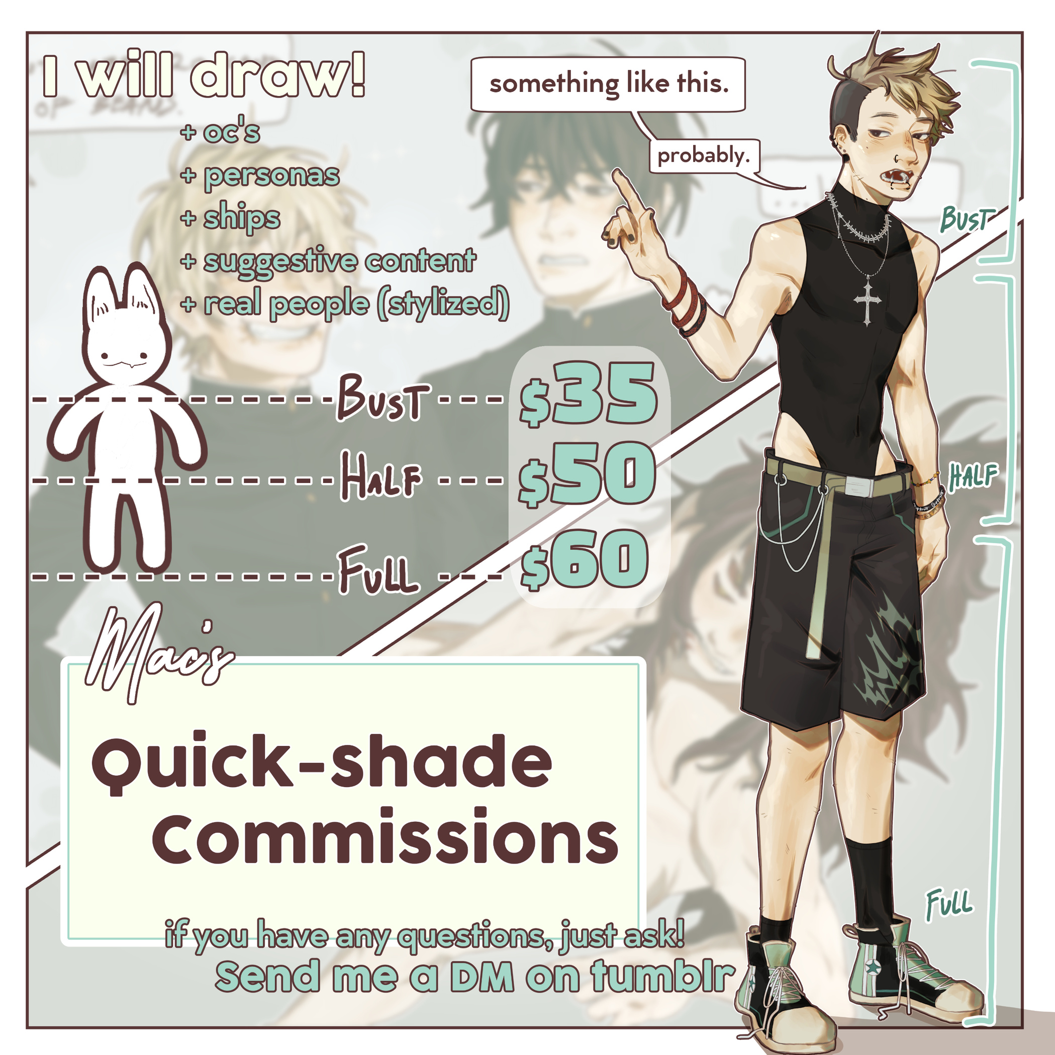 From there, I will confirm your price given your ask. (and explain if needed)I may also ask you for refferences/more detail about your given character if I'm not familiar!PLEASE DO NOT BE AFRAID TO ASK FOR SMALL PRICE ADJUSTMENTS